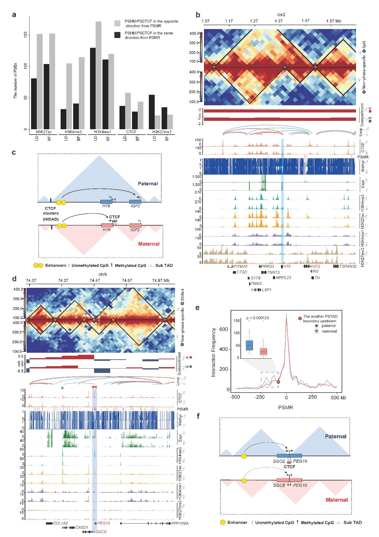 (3)在H19–IGF2与SGCE–PEG10区域重建复杂印记模型。研究人员进一步发现,多个PSE受到多种表观标记共定位调控,提示POE机制远非传统印记模型可完全解释,而是涉及跨层级、多通路的复合调控网络。在H19–IGF2区域,研究系统地还原了母源甲基化丧失导致CTCF结合增强,形成绝缘子结构,阻断增强子对IGF2的激活,进而实现在母源染色体中H19表达、在父源染色体中IGF2表达的经典印记机制,并首次在猪中验证其与小鼠类似的印迹调控机制。SGCE–PEG10区域也发现具备与H19–IGF2高度相似的多层级精细表观调控机制,结合启动子甲基化、CTCF结合、PSTAD形成与增强子–启动子互作共同驱动印记分相表达,且经CRISPR干扰与3C-qPCR实验证实其关键调控作用。