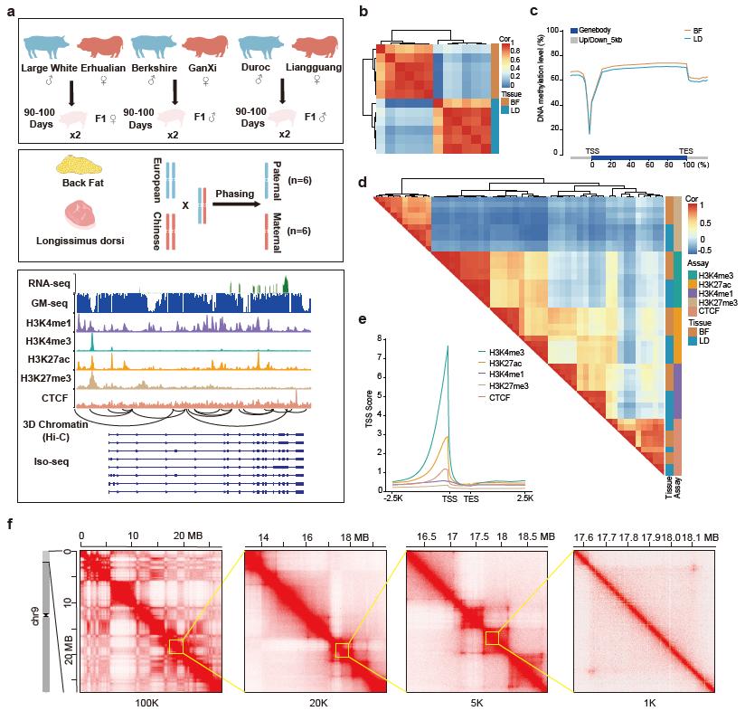 8月14日,乐竞在线注册猪遗传改良与种质创新全国重点实验室黄路生院士团队联合四川农业大学李明洲教授团队,在Nature Communications杂志上在线发表题为“Mechanism of Parent-of-origin Effects revealed by Multi-omic data in Euro-Chinese Hybrid Pigs”的研究论文。该研究构建了全球首个同时含染色质构象、DNA甲基化及多种组蛋白修饰的杂交猪父母相高分辨率表观图谱,系统揭示了其在亲本效应(Parent-of-origin effects, POE)中的协同调控机制。中国科学院院士、中国畜牧兽医学会理事长黄路生,乐竞在线注册张志燕研究员为共同通讯作者,乐竞在线注册李晨宇博士和葛梅博士为共同第一作者; 四川农业大学李明洲教授、龙科任副教授、韩紫音为论文共同作者。