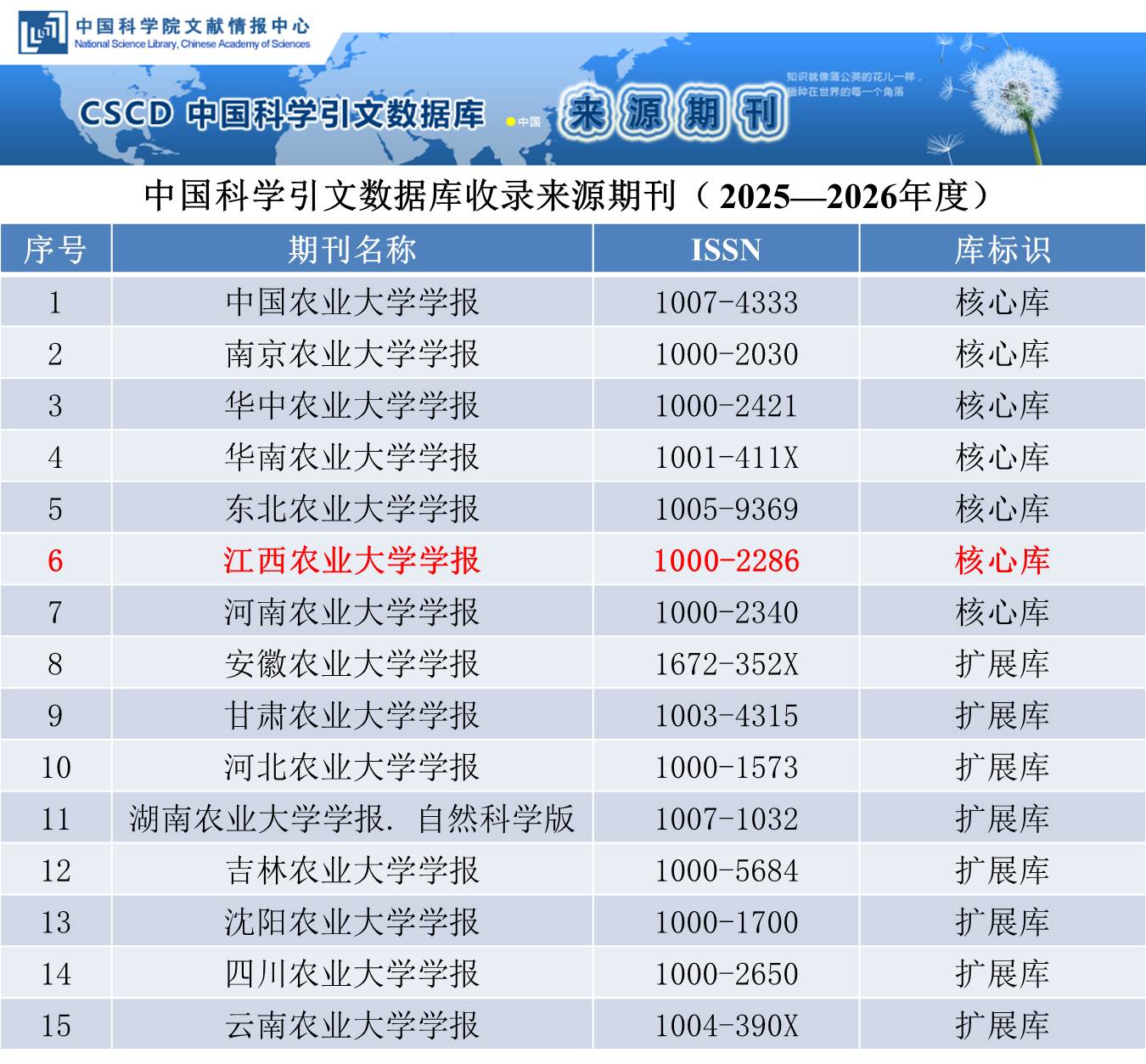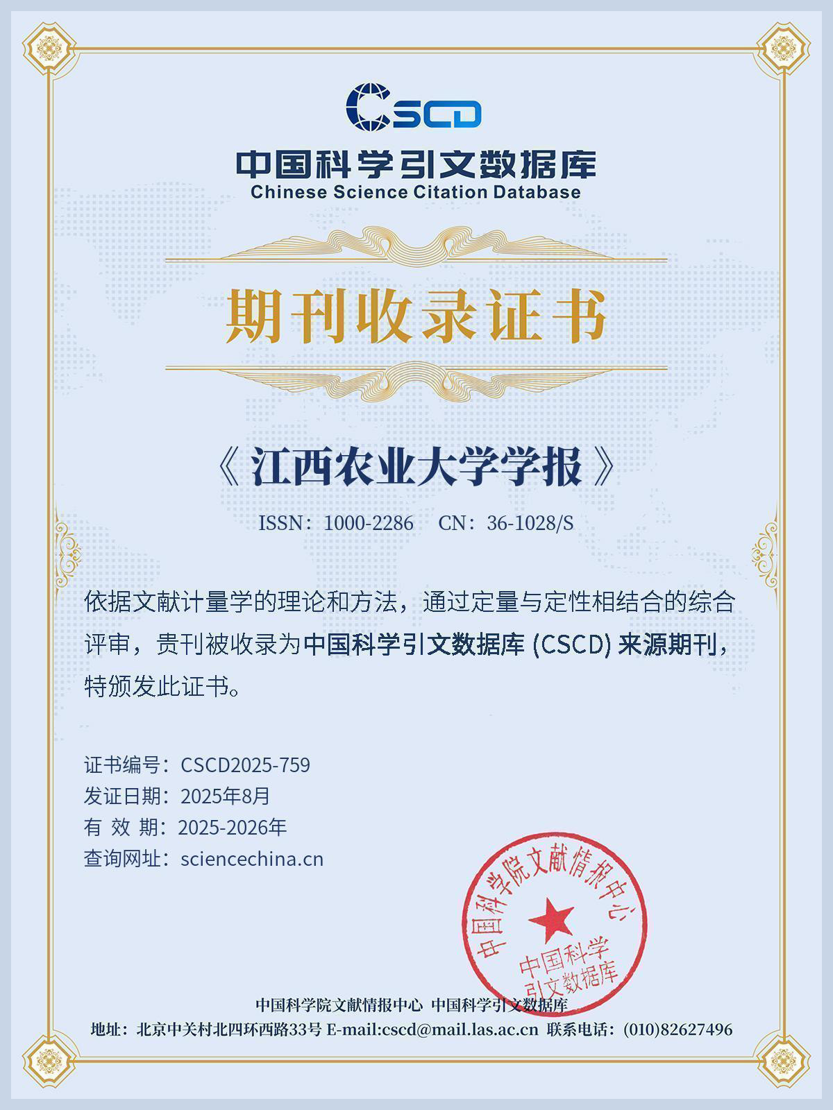 近日,中国科学院文献情报中心发布了中国科学引文数据库(Chinese Science Citation Database, 简称CSCD) 2025—2026年度来源期刊遴选结果,《乐竞在线注册学报》被《中国科学引文数据库(CSCD)来源期刊(2025—2026年度)》核心库收录。这是《乐竞在线注册学报》连续四次入列CSCD核心刊(2019—2020、2021—2022、2023—2024、2025—2026版),也是江西省唯一中文CSCD核心刊。
